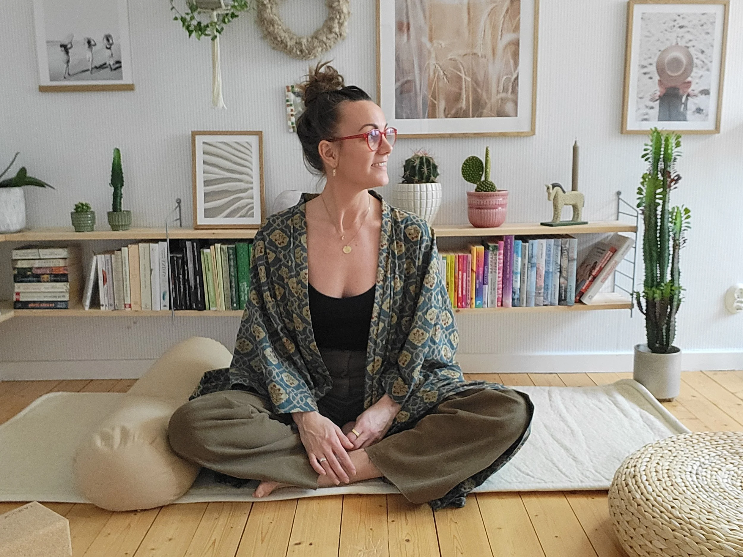 Förbered gärna med en filt och om du har ett bolster eller en kudde kan det vara skönt att lägga under knäna i de liggande avslappningsövningarna